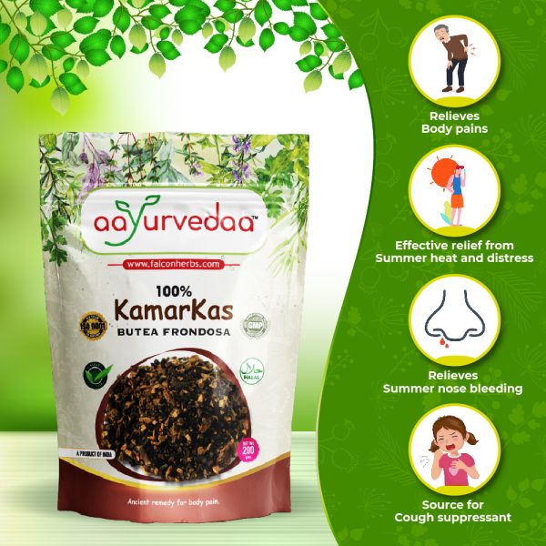 Kamarkas offers multiple benefits, including the treatment of mouth ulcers and infections, aiding digestion to prevent constipation, and assisting in controlling loose stools during diarrhea.